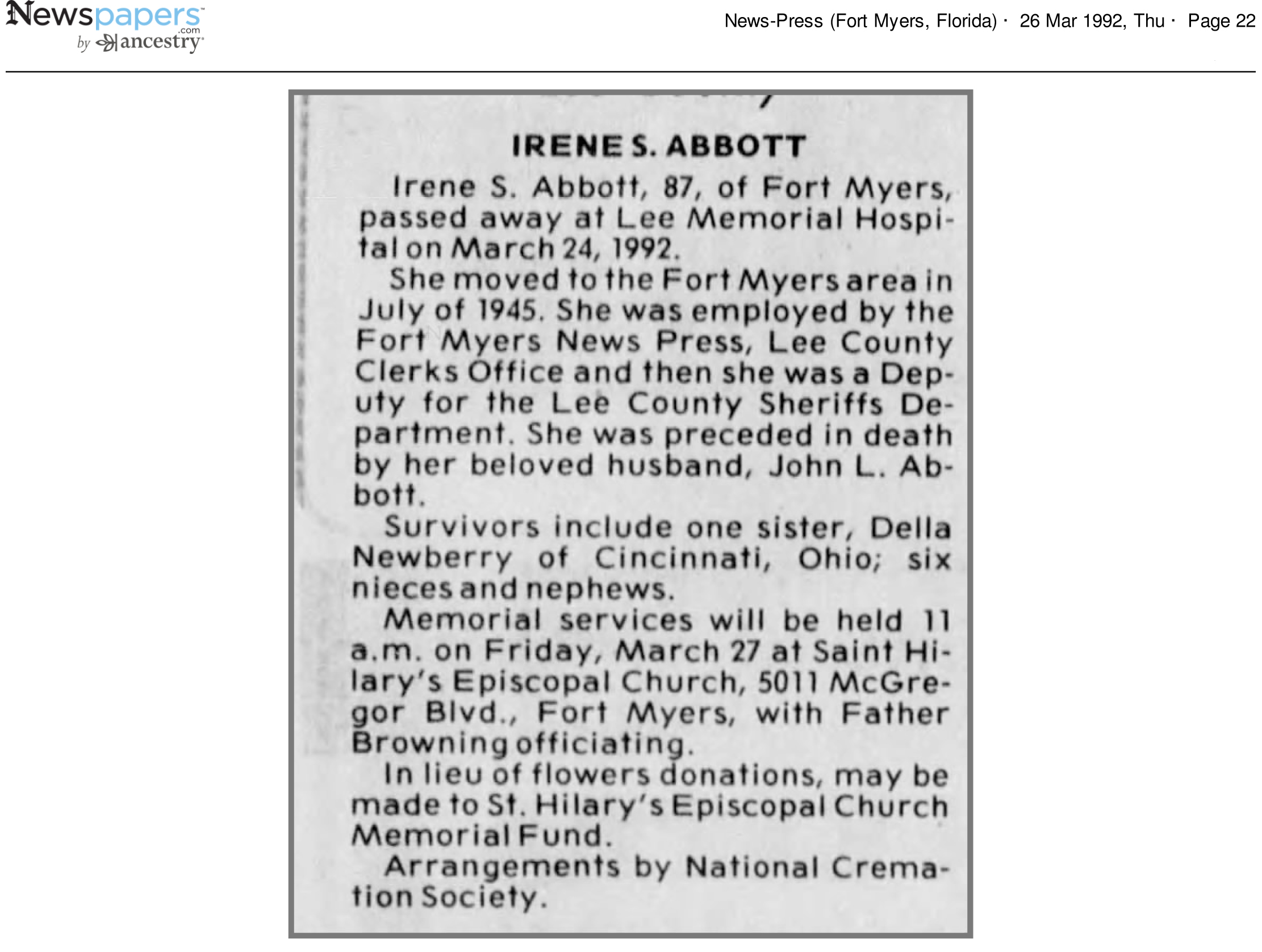 U.S. Social Security Death Index - Irene S. Abbott SSN 373-07-2675 Issued: Michigan Born: 20 Mar 1905 Died: 24 Mar 1992 Last Known Residence: Fort Myers, Lee County, Florida 33901
