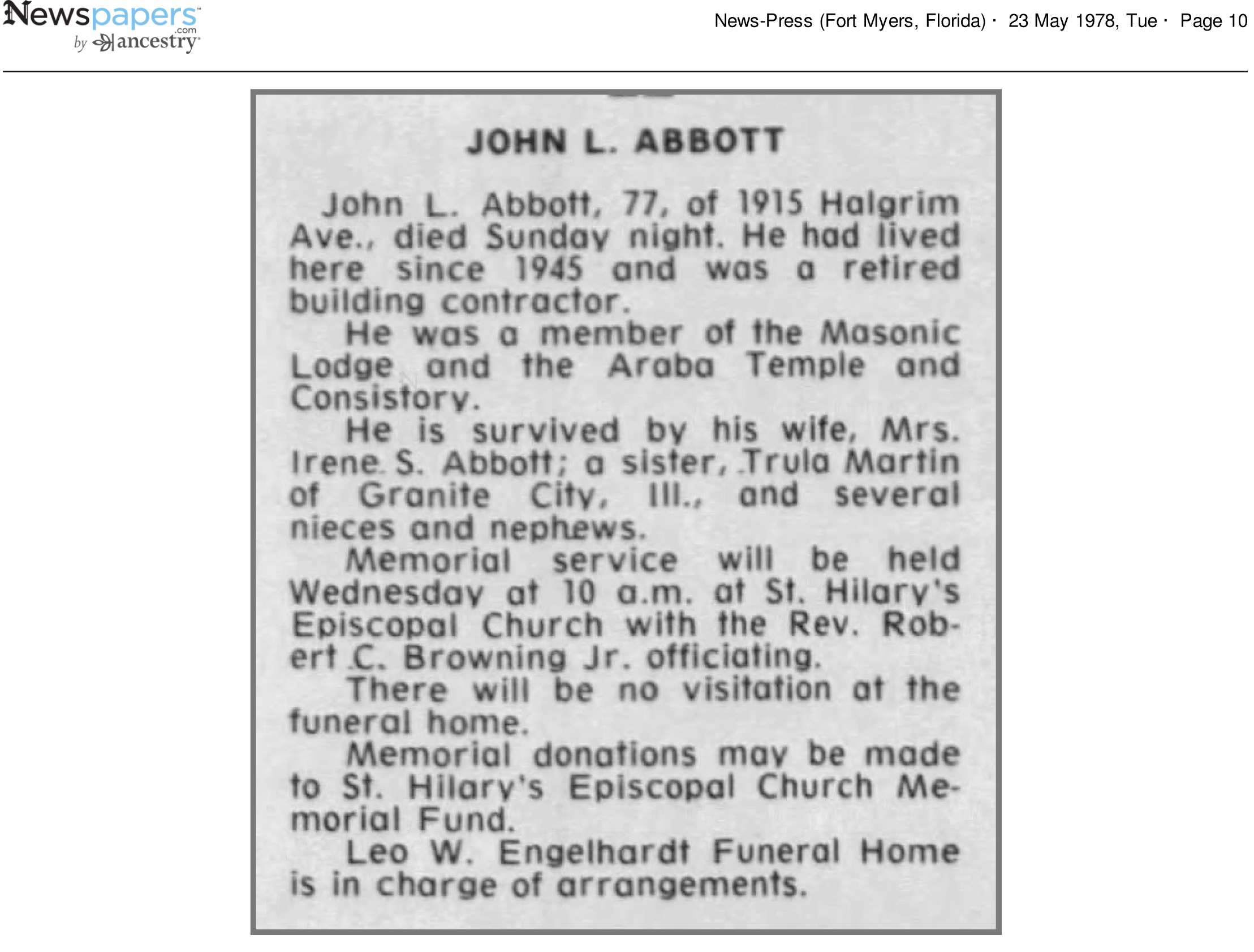 Florida Death Index 1877-1998 Death Certificate Transcription by David Abbott: John L Abbot Age: 77 Certificate: 78-40640 Death Date: 21 May 1978 Birth Date: 12 Mar 1901 Location: Fort Myers Hospital: Lee Memorial Hospital Married: Irene Nangle SS#: 374-14-5220 Retired Contractor Residence: 1915 Halgrim Ave., Fort Myers, Lee County, Florida 33901 Father: John M. Abbott Mother: Lara Main Informant: Mrs. Irene S. Abbott Cremation Cemetery: Charlotte Cremation Location: Punta, Gorda, Florida U.S. Social Security Death Index - John Abbott SSN 374-14-5220 Issued: Michigan Born: 12 Mar 1901 Died: May 1978 Last Known Residence: Fort Myers, Lee County, Florida 33901Transcription by David Abbott of WITH THE COLORS FROM PIKE COUNTY 1917 1918 1919 Illinois USA