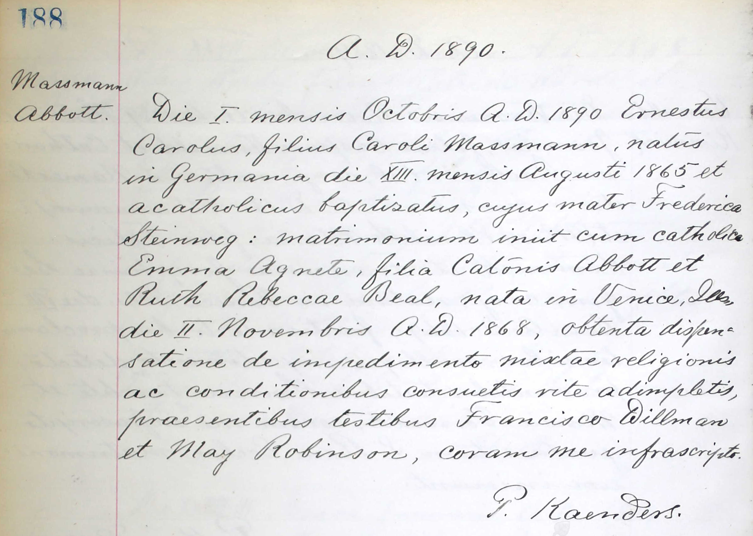 Marriage Place: St. Mark, Venice, Illinois Oct 1, 1890 Groom: Ernestus Carolus Massmann Father: Caroli Massmann Spouse: Emma Agnete Abbott Father: Catonis Abbott Mother: Ruth Rebeccae BealChildren: