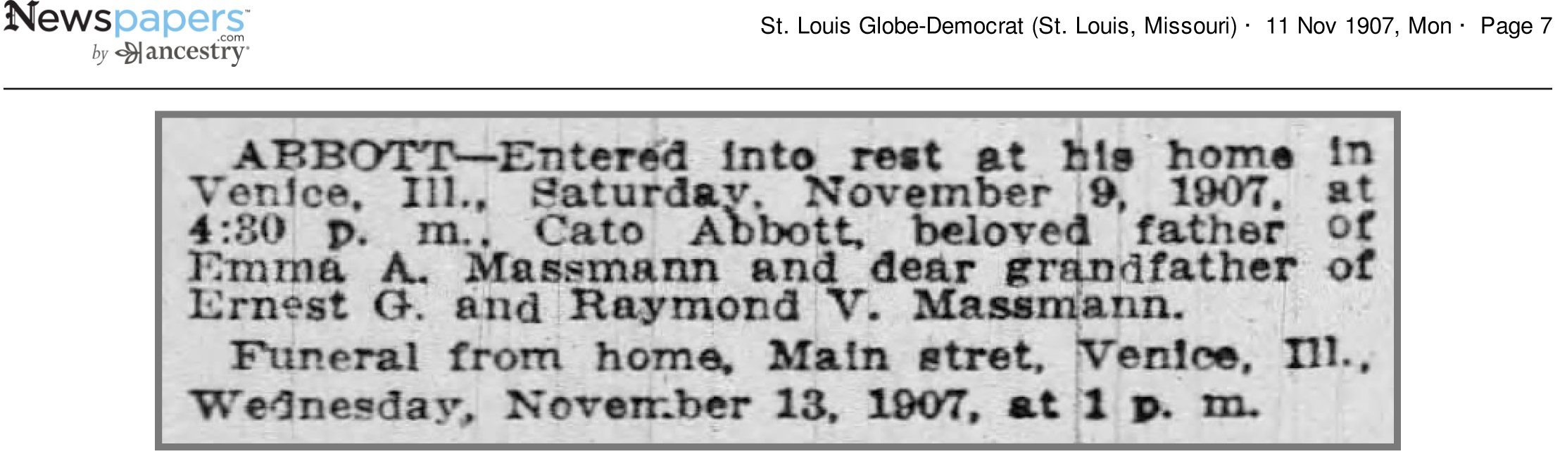 Death Certificate Transcription view ducumentMarriage: Ernest C. Massmann - St. Mark Venice, Madison County, Illinois - Oct 1, 1890 - Vol/Pg: 9/109 Lic: 1410Certificate #20612 - Age 51 Yrs 7 Months 9 Days Place of Death: Baptist Hospital St. Louis Missouri Emma A. Huckabay Female White Married: William Huckabay DOB: November 2, 1868 Venice, Illinois Father: Cato Abbott Yourkshire, England Mother: Ruth Beal Illinois Informant: Ernest Massman Venice, Illinois Burial Bellefontaine Cemetery May 13, 1920