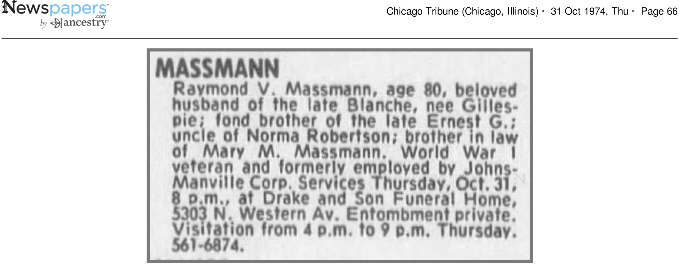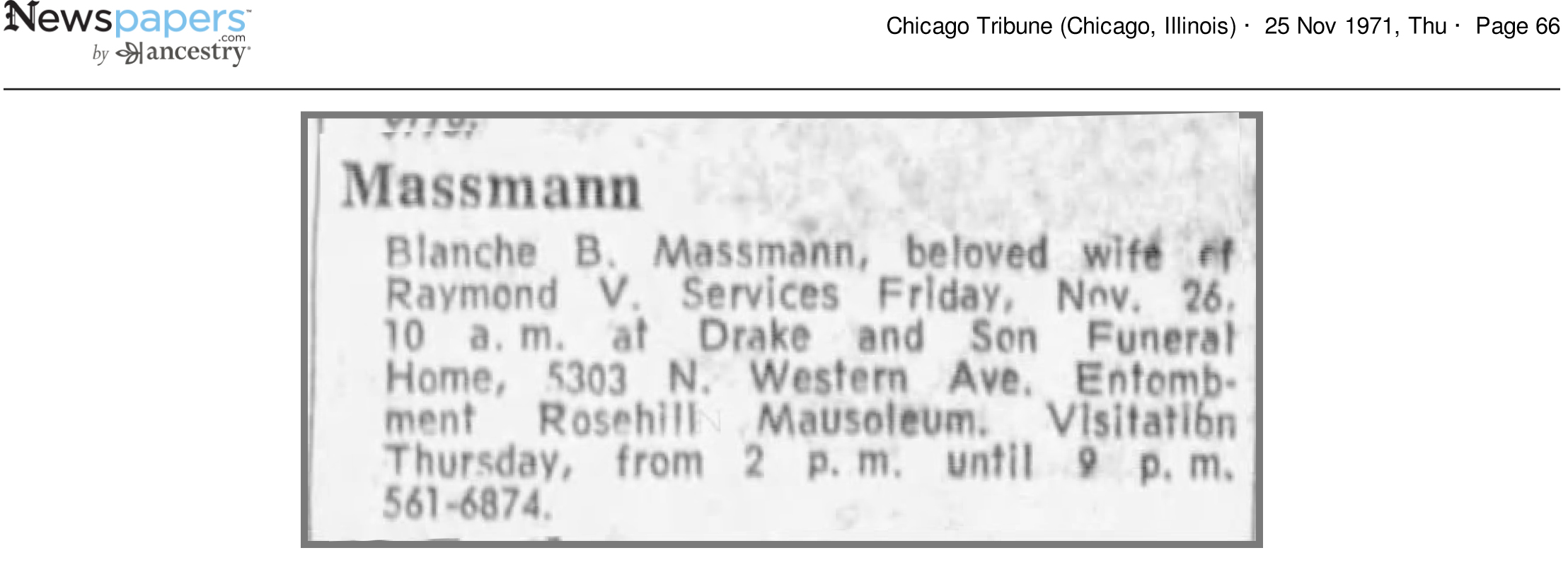 Died: 23 Nov 1971 • Chicago, Cook County, Illinois • Age 81 • Obituary Clipping